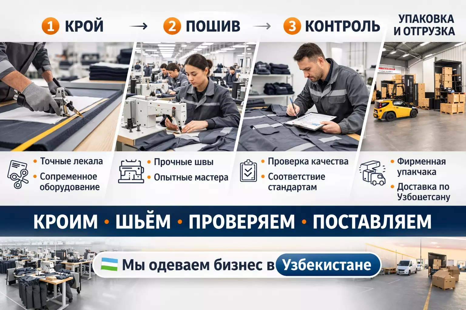 Мы — производственная компания из Узбекистана, которая шьёт демисезонную спецодежду для заводов и производственных предприятий. Работаем в формате B2B и берём на себя полный цикл: согласование модели и материалов, пошив, контроль качества, нанесение логотипа (по запросу), упаковка и отгрузка. Наше ключевое преимущество — предсказуемость: образец за 5 дней, серийная партия — до 15 дней, минимальный заказ — от 50 комплектов. Мы фиксируем требования в ТЗ, обеспечиваем стабильные размеры и качество от партии к партии и помогаем клиентам быстро закрывать потребность персонала в рабочей одежде. Если вы пришлёте количество, срок и город доставки — подготовим расчёт и коммерческое предложение.